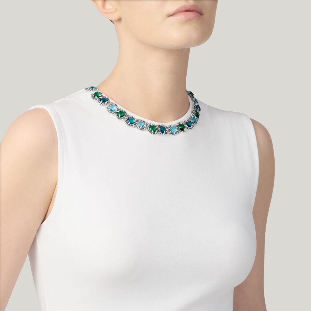 Luminosità, colore e versatilità nell’indosso caratterizzano la collezione BLUE IVY, la quale impiega numerosi cristalli rotondi sfaccettati in una particolarissima palette a tre che esplora le varie sfumature del blu: celeste mare, azzurro intenso e verde smeraldo. Il decoro in fusione d’argento, ispirato ad un tema micro-floreale abbinato ad una miriade di sferette in argento brunito, abbraccia ogni singola pietra, regalando una vera esplosione di colore.